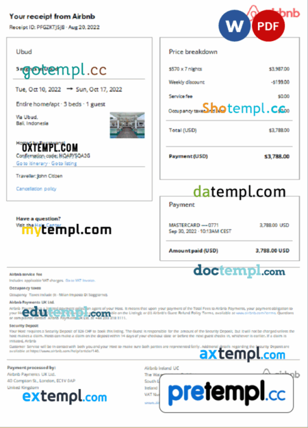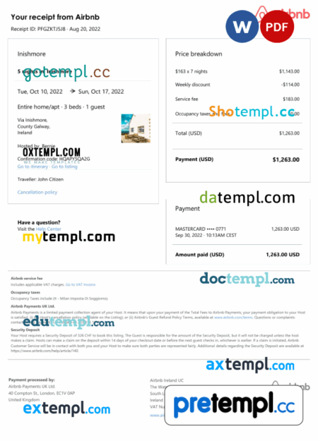 Irish Airbnb booking confirmation Word and PDF example