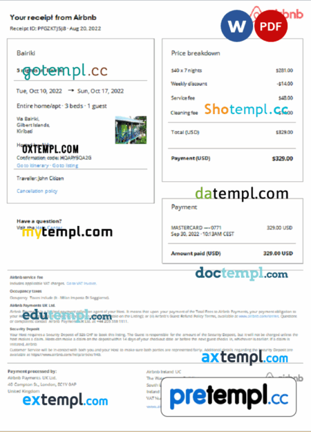 Kiribati Airbnb booking confirmation Word and PDF example