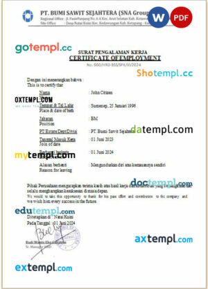 Indonesia PT Bumi Sawit Sejahtera certificate of employment Word and PDF download template