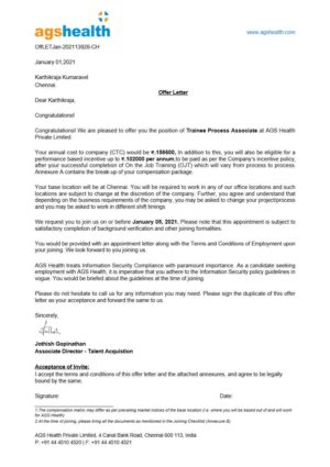AGS Health Pvt. Ltd. Trainee Process Associate offer letter in Word and Pdf formats