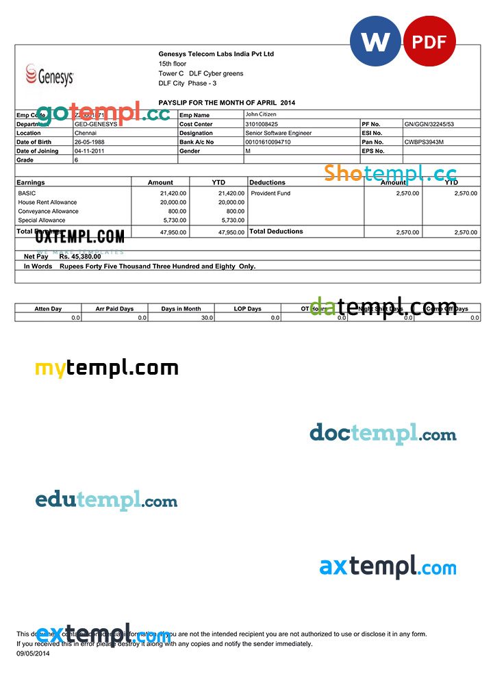 India Genesys Telecom Labs Indian Pvt Ltd payslip example in Word and PDF formats