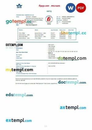 Pegasus Airlines airplane e-ticket, Word and PDF download template, 2 pages