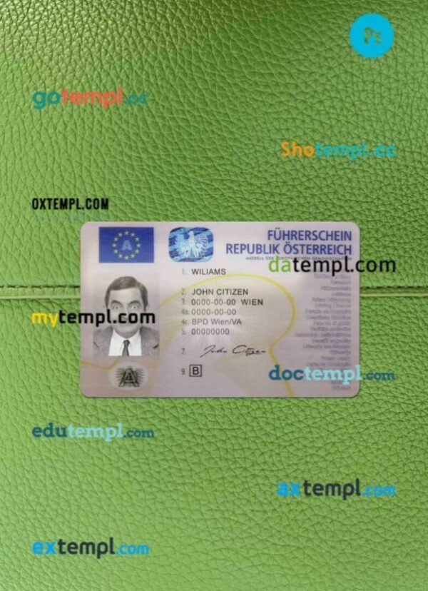 Our Austria driver’s license template offers two options in one package: editable PSD files for both photo and scan looks. Compatible with Adobe Photoshop, this template is fully customizable, requiring only basic editing knowledge to personalize.