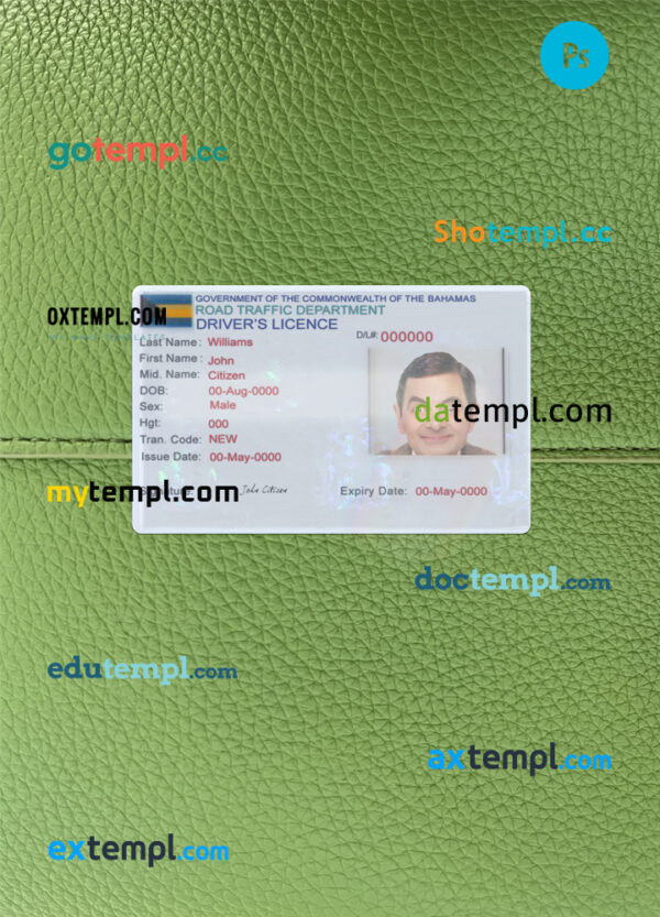 Our Bahamas driver’s license template offers two options in one package: editable PSD files for both photo and scan looks.