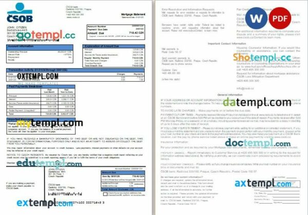 Czech ČSOB bank mortgage statement, 2 pages, editable template in PDF and Word