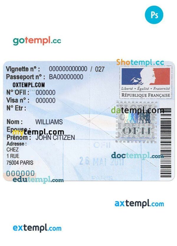 Fully scalable and editable French residency OFII visa stamp PSD example at the best price – well organized, named & very easy to use.
