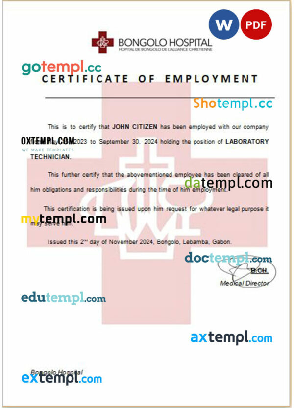 Fully editable Gabon Bongolo Hospital certificate of employment Word and PDF template at the best price.