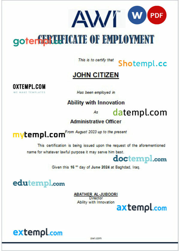 Fully editable Iraq Ability with Innovation certificate of employment Word and PDF template at the best price.