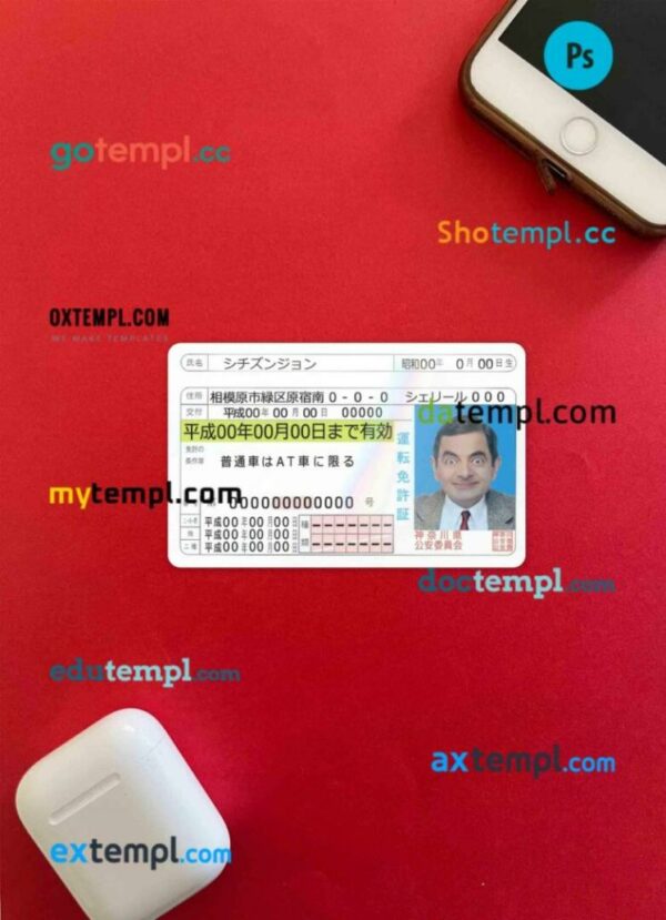 Our Japan driver’s license template offers two options in one package: editable PSD files for both photo and scan looks.