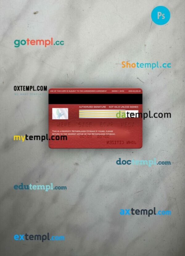 Our Netherlands Citibank visa classic card PSD template provides a multi-functional solution with a clean design, providing both the front and back of the card for a realistic look.