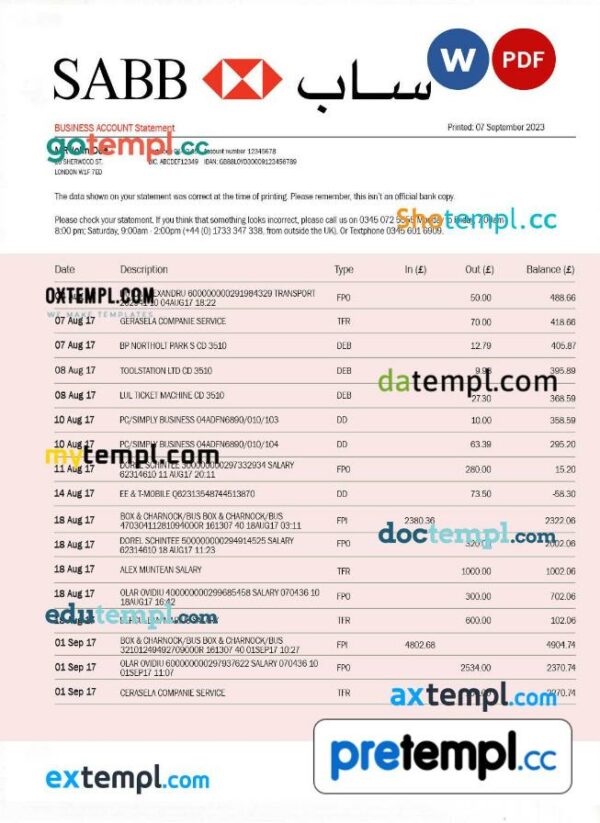 SABB Bank company statement Word and PDF template