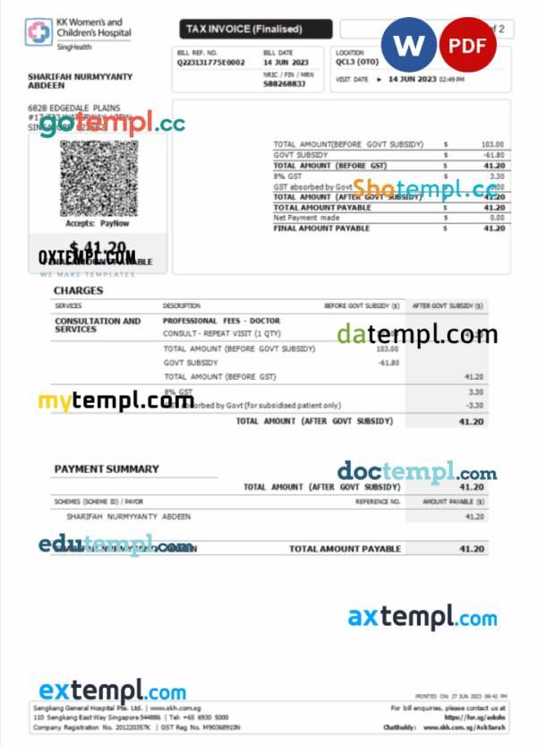 Fully editable Singapore KK Hospital tax invoice Word and PDF example – individual design