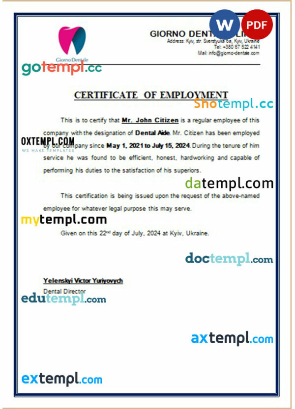 Fully editable Ukraine Giorno Dental certificate of employment Word and PDF template at the best price.
