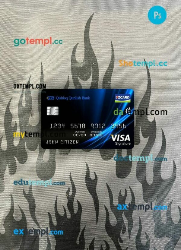 Uzbekistan Qishloq Qurilish Bank visa signature card PSD scan and photo-realistic snapshot, 2 in 1